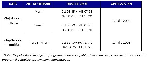 Marketing2026-04-28T11:23:21+03:00Cluj-Napoca, 28 aprilie 2026 – Aeroportul Internațional „Avram Iancu” Cluj și Consiliul Județean Cluj, împreună cu compania aeriană Animawings, anunță, în premieră, introducerea zborurilor regulate directe de la Cluj-Napoca către Viena și Frankfurt – două dintre cele mai importante hub-uri aeriene din Europa și printre cele mai dorite destinații de către pasagerii din Transilvania.