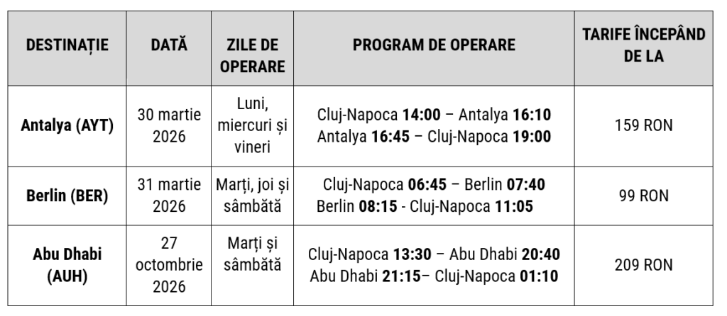 Astfel, începând din primăvara anului viitor, odată cu debutul sezonului de vară 2026, pasagerii vor putea călători de pe aeroportul clujean spre Antalya, prin zborurile directe Wizz Air, ce vor fi operate începând din 30 martie 2026, cu 3 frecvențe pe săptămână, în zilele de luni, miercuri și vineri, și spre Berlin (capitala Germaniei), din 31 martie 2026, cu 3 frecvențe pe săptămână, în zilele de marți, joi și sâmbătă.