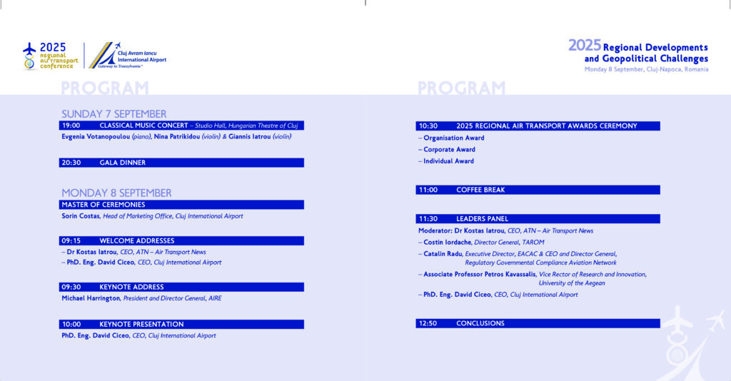 Aeroportul Internațional Avram Iancu Cluj a găzduit în data de 8 septembrie 2025, cea de-a patra ediție a conferinței regionale de aviație ,,2025 Regional Air Transport Conference – Regional developments and geopolitical challenges” în colaborare cu platforma ATN – Air Transport News, specializată în organizarea unor prestigioase conferințe de aviație, pe plan european.