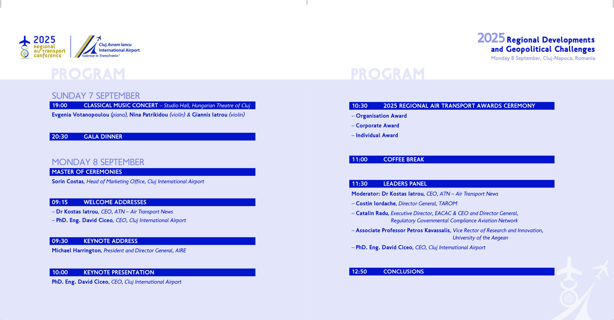 Aeroportul Internațional Avram Iancu Cluj a găzduit în data de 8 septembrie 2025, cea de-a patra ediție a conferinței regionale de aviație ,,2025 Regional Air Transport Conference – Regional developments and geopolitical challenges” în colaborare cu platforma ATN – Air Transport News, specializată în organizarea unor prestigioase conferințe de aviație, pe plan european.